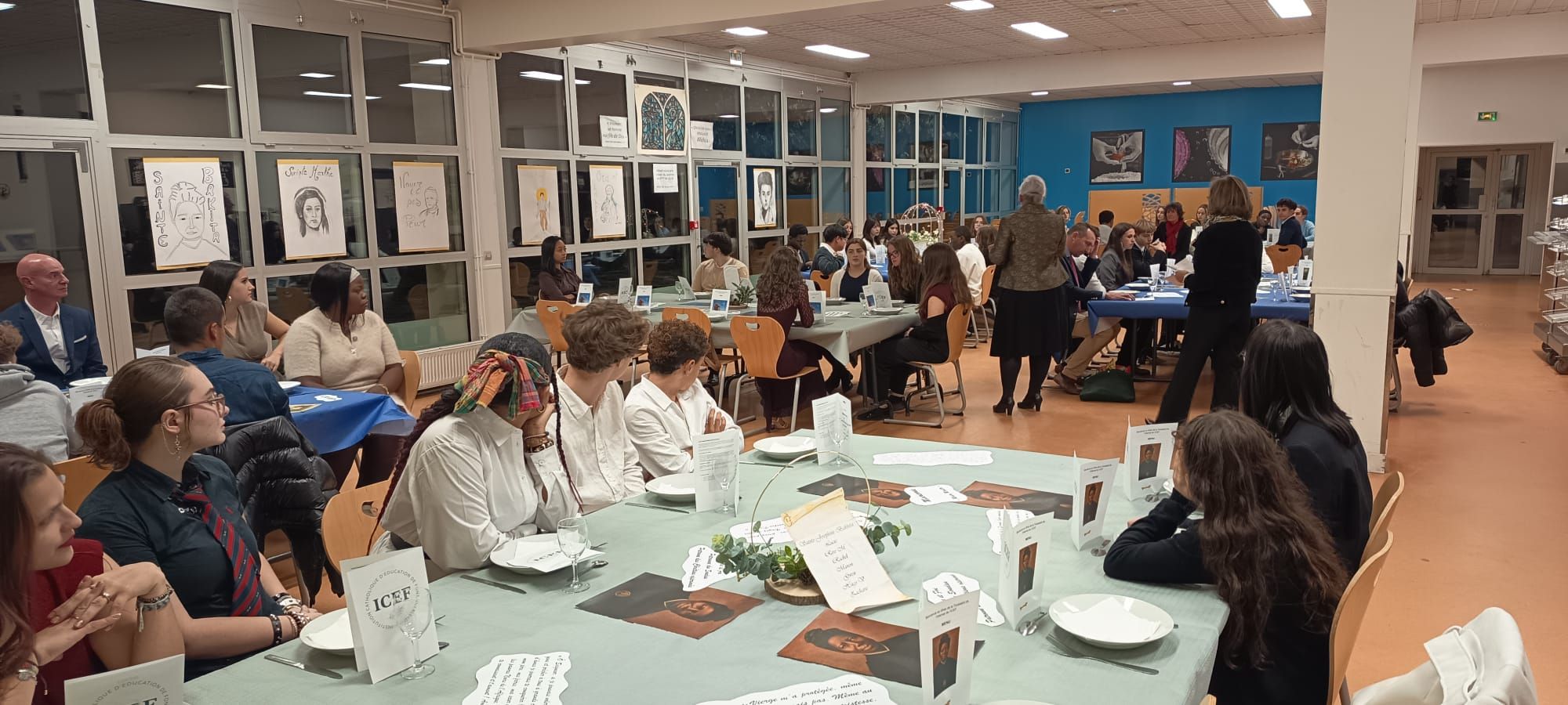 Servi à table dans une ambiance élégante et festive, ce repas a mis à l’honneur les saints choisis cette année, symboles de jeunesse et de famille : Saint Jean-Paul II, Sainte Joséphine Bakhita, Saint Pier Giorgio Frassati, Saint Carlo Acutis, ainsi que les noms des Saints qui représentent nos internats : Saint Benoît et Sainte Marthe.